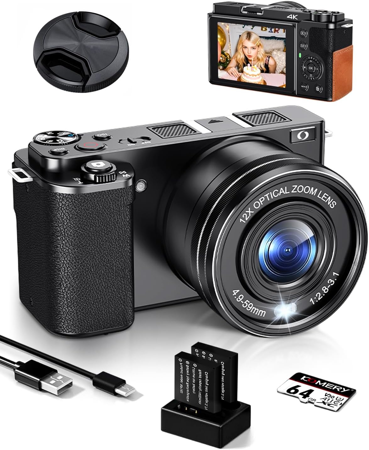 Ade Cámara Digital, 4K 64MP Cámara de Fotos con Sensor CMOS y Zoom óptico de 12x, Cámara compacta para Fotos con Pantalla de 2,8", WiFiHDMI, Tarjeta de 64 GB, 2 baterías y Cargador Negra