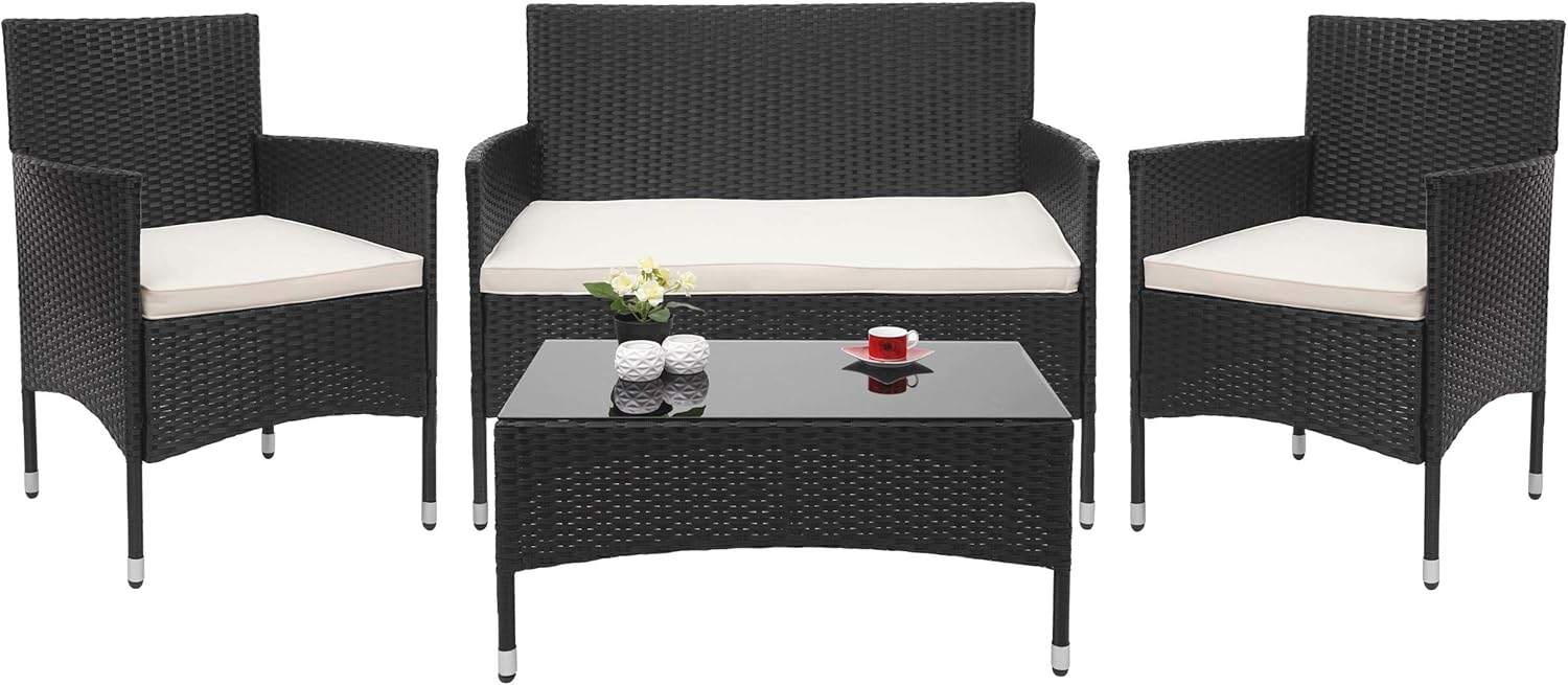 Conjunto de jardín de polirratán HWC-D82, conjunto de salón - negro con cojines crema