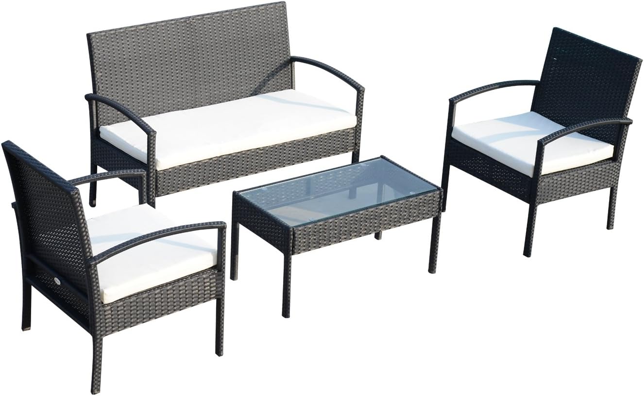 Outsunny Conjunto de Muebles Ratán Jardín Terraza 4 Plazas 4 Plazas 1 Mesa de Café 2 Sillones 1 Banco con Cojín Marco Metal