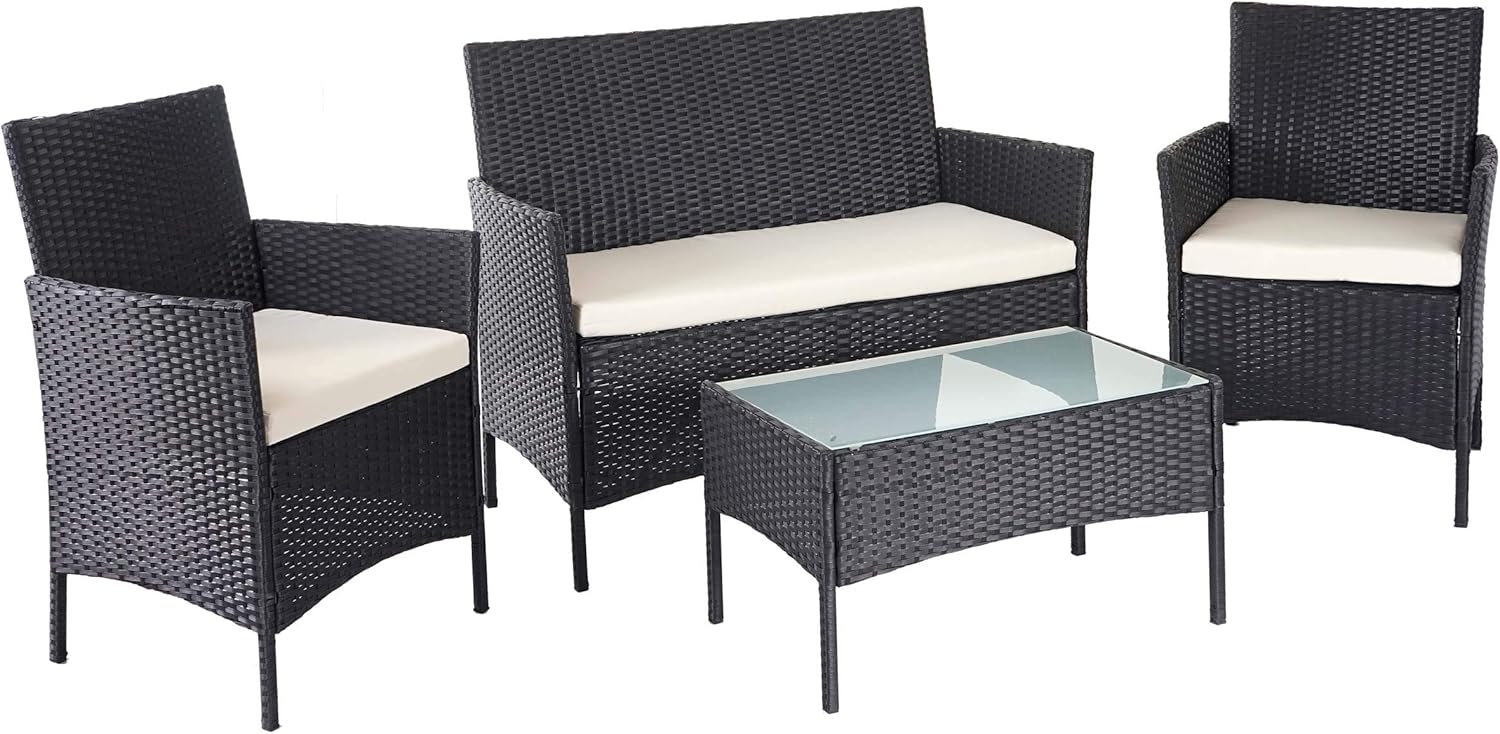 Conjunto de jardín de polirratán HWC-D82, conjunto de salón - negro con cojines crema