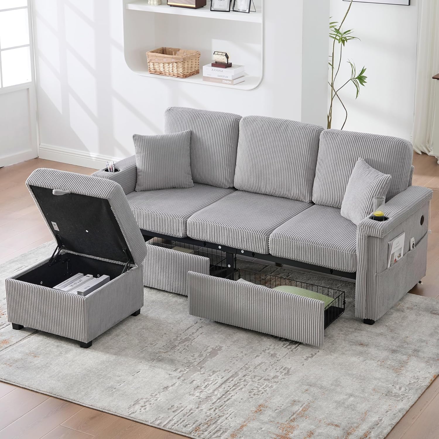 Sofá de 3 plazas con iluminación LED y puerto USB-C, reposapiés con contenedor, 2 cajones, prácticos portavasos y bolsillos laterales, sofá de esquina en L, terciopelo acostado B-Gris claro